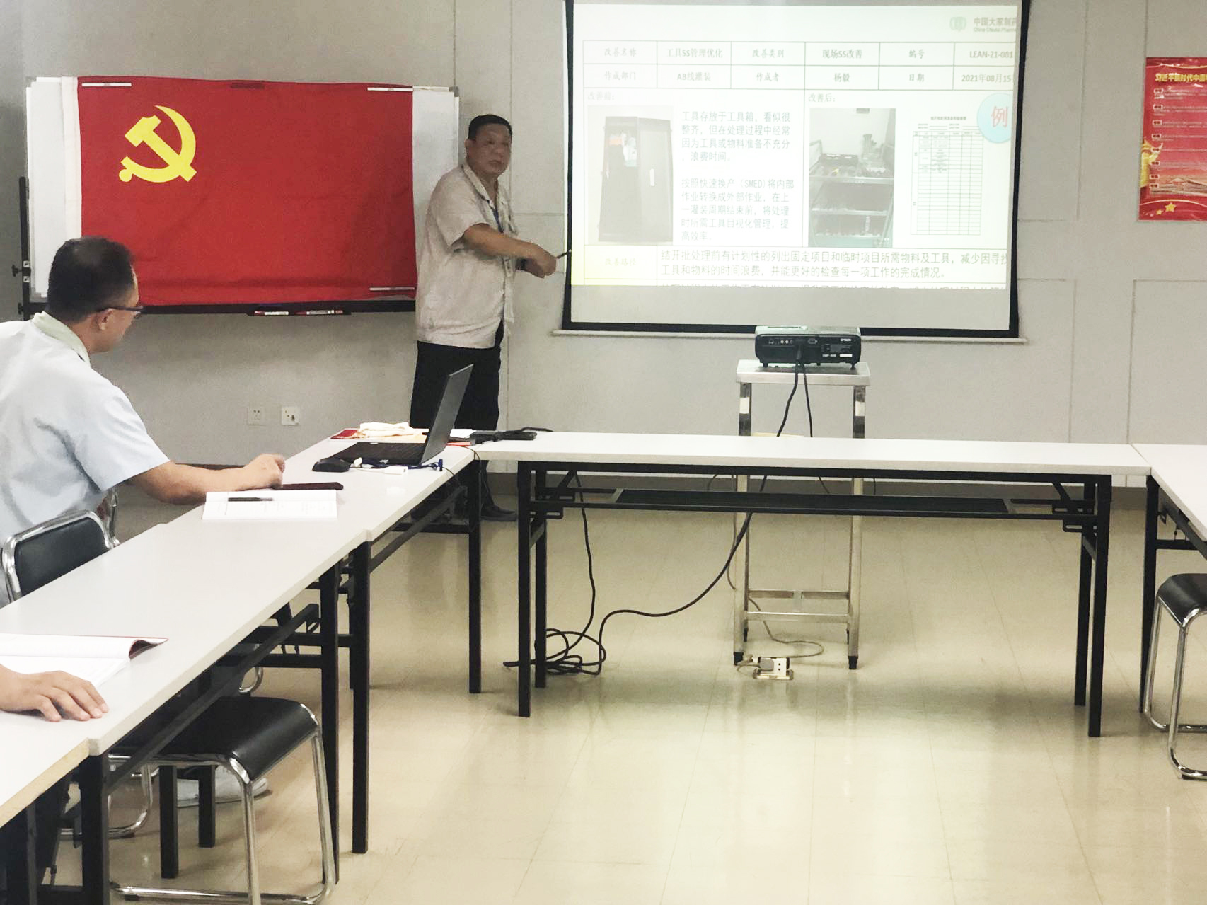上半年,支部全體黨員積極行動投身到各項工作中。黨員先鋒帶動精益生產,截止到今年6月份,生產板塊所有精益化生產合理化提案共計124項,其中第一黨支部黨員共占23項,占比18.5%。即便如此,支部全體黨員不甘于“現狀”,成立了三個一線生產黨員先鋒崗。6月30日召開支部黨員大會,期間由第一黨支部書記陳傳力,以幻燈片的方式,對以往改善效果顯著的項目進行深入剖析。將專業的術語轉化為真實的案例,逐項傳授給參會的每一位黨員,讓支部黨員在生產一線精益化改善項目能更上一個臺階。